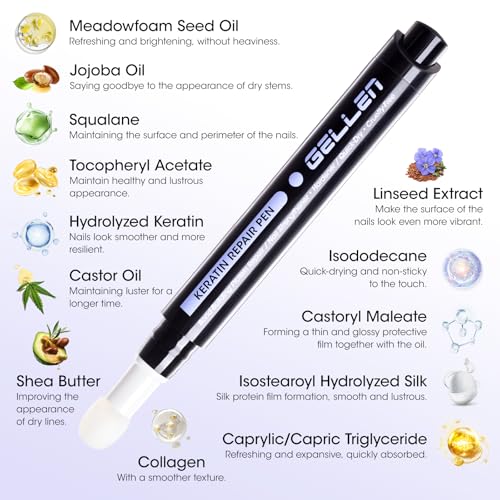 ๐ข๐ง๐ข๐ฌ๐ก: The Gellen Nail Keratin Repair Pen contains Meadowfoam Seed Oil, Caprylic/Capric Triglyceride, and Isododecane, which help ensure that no oily residue is left on the nails. This nail hardener pen is formulated to dry quickly, leaving behind a micro-thin, non-greasy, and non-sticky finish. The active ingredients remain on the nail surface to enhance smoothness and luster.