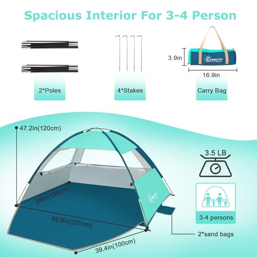 Large Space for Your Family: With dimensions of 86.6″ L x 59″ W x 49″ H, COMMOUDS beach tent offers a spacious interior to comfortably accommodate 3-4 people. The 37″ extended front porch creates extra space for various activities, catering to families, couples, or small groups