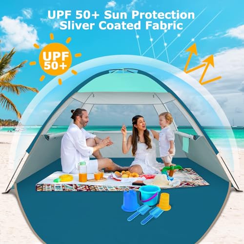 Easy Assemble & Portable: Setting up this travel beach tent is a breeze, taking only a few minutes. The unique folding capability of this tent allows it to be taken down and stored anywhere. With a folded size of 16.5″ x 3.9″ x 3.9″ and weighing only 3.5 lbs, it is compact and lightweight enough to be carried in a backpack or luggage for your summer trips