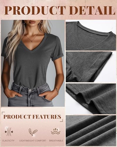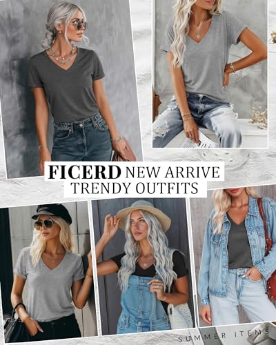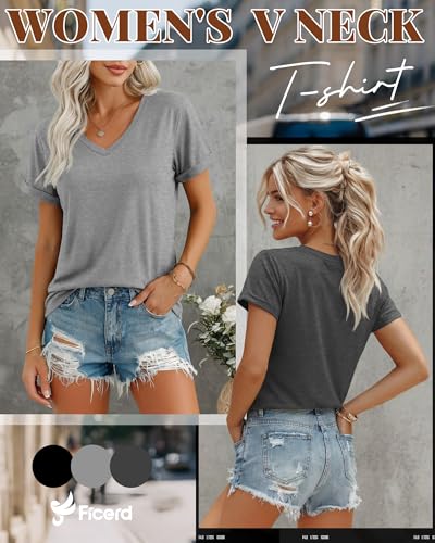 Ficerd 3 Pack Women’s V Neck T Shirts, Summer Casual Short Sleeve Tops Loose Fit Rolled Sleeve Tees Trendy Shirts