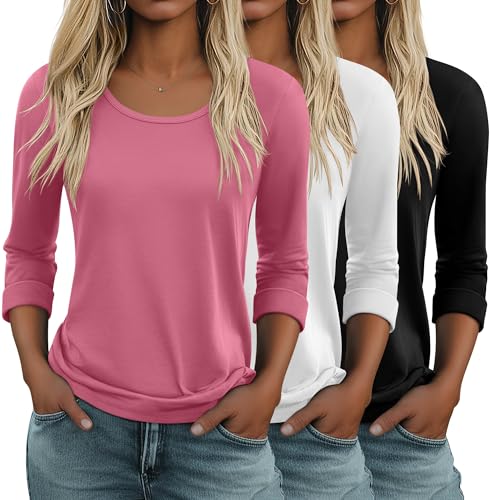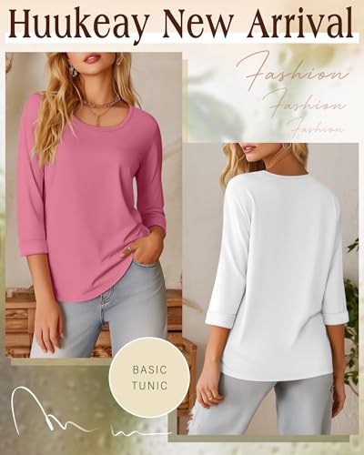 Huukeay 3 Pack 3/4 Length Sleeve Women’s Tops Trendy Crew Neck Roll Basic Tees Top Dressy Loose Casual T-Shirt Blouses