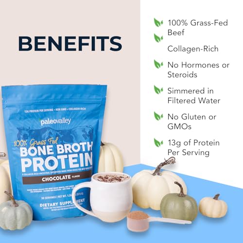 Paleovalley 100% Grass Fed Beef Bone Broth Protein Powder – Rich in Collagen Peptides for Hair, Skin, Gut Health, Bone and Joint Support – 15g Protein Per Serving – No Gluten or GMOs – Chocolate