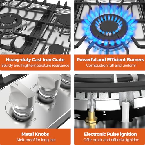 【Easy-to-Clean Stainless Steel Material】The gas cooktop 30 inch is crafted with premium 304 stainless steel and sturdy cast iron grates, the cooktop features fully sealed burners that block food debris. The removable grates and flat surface enable hassle-free cleaning with just a damp cloth or mild detergent