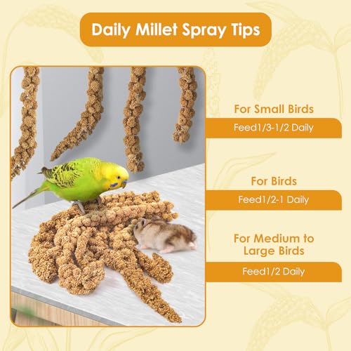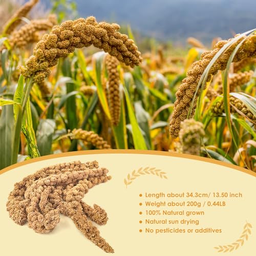 PERFECT FOR ALL BIRDS: Parrot millet food is a popular and nutritious seed, each natural grown length is about 34cm/13inch, and approx. 0.44lb/7oz in total weight, suitable for kinds of bird species, like canary, budgie, parakeet, conure, lovebird, cockatiel and finches. Besides, millet spray is also a favorite food for hamster, chinchilla and more rodent pets