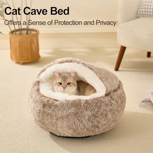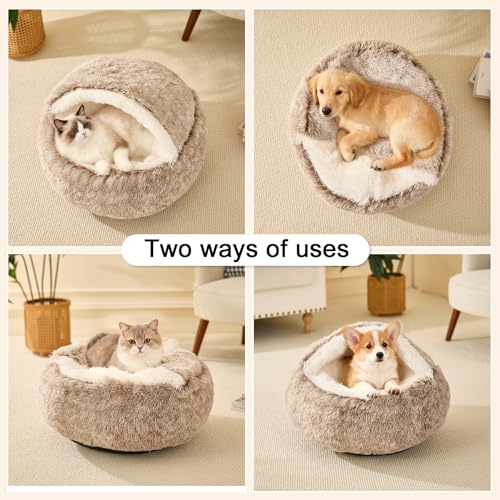 【Soft & Cozy Materials】This round calming covered bed is lined in fleece with a long-haired plush rim, which is a perfect place for your pet to rest and provide a secure area for cats of all sizes to hide in, helping reduce stress levels