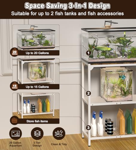 Space Saving 3-In-1 Design: Our 20 gallon fish tank table stand features a 3 tier design. The top tier accommodates 5-20 gallon aquariums. The middle tier can be used for additional aquariums or other supplies, supporting tanks from 5 to 15 gallons. The bottom tier is ideal for storing fish food, cleaning tools, plants, books, and more. This vertical arrangement maximizes space efficiency, allowing convenient access to your essentials