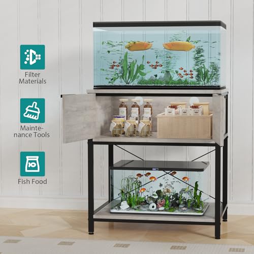 Large Storage and Organization Space: The fish tank stand is equipped with a wide desktop and storage cabinets to organize fish food, fish nets, filter replacement bags and other commonly used aquarium equipment. The dedicated threading holes on the side of the aquarium stand can organize the wires of filter pumps and lamps in an orderly manner, avoiding the accumulation of all kinds of messy wires.